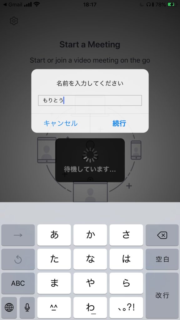 名前を入力し、「続行」を押すと iPhoneの場合は「カメラ」「マイク」「通知」の3つのポップアップが表示されます。