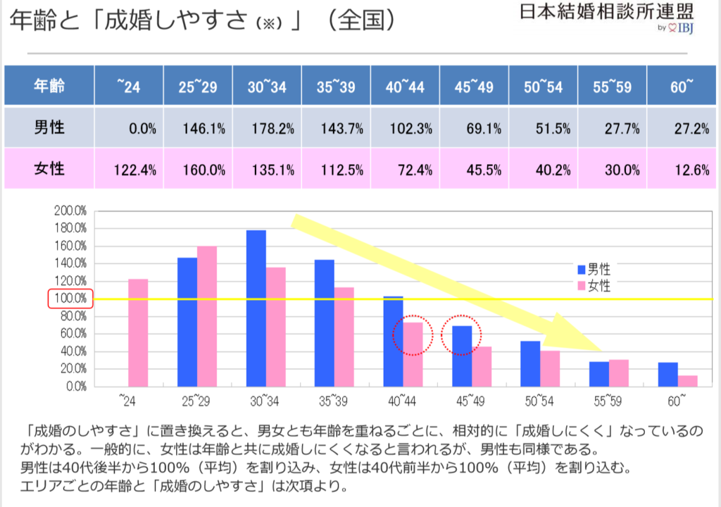 2018年IBJ成婚者データ「年齢と成婚しやすさ(全国」より抜粋