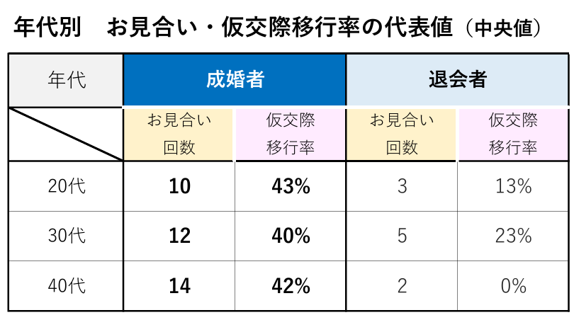IBJの最新の成婚白書によると、成婚者は途中退会者に比べ、仮交際への移行率・お見合い回数ともに2倍近いという傾向が出ています。
