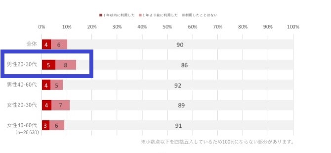 1年以内利用、利用経験共に最も多いのが実は男性20~30代。