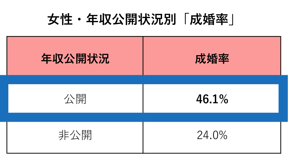 • 年収を公開している女性は、非公開の約2倍成婚しやすい