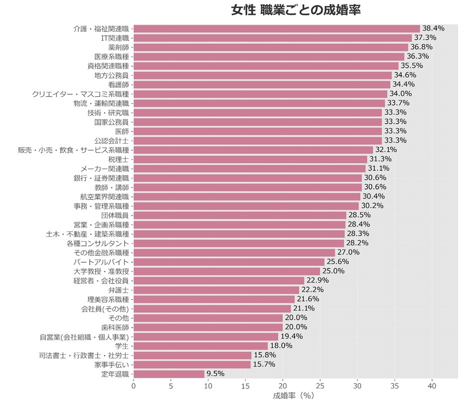 最新の「IBJ成婚白書2024年度版」には、女性の職業別成婚率も掲載されています。