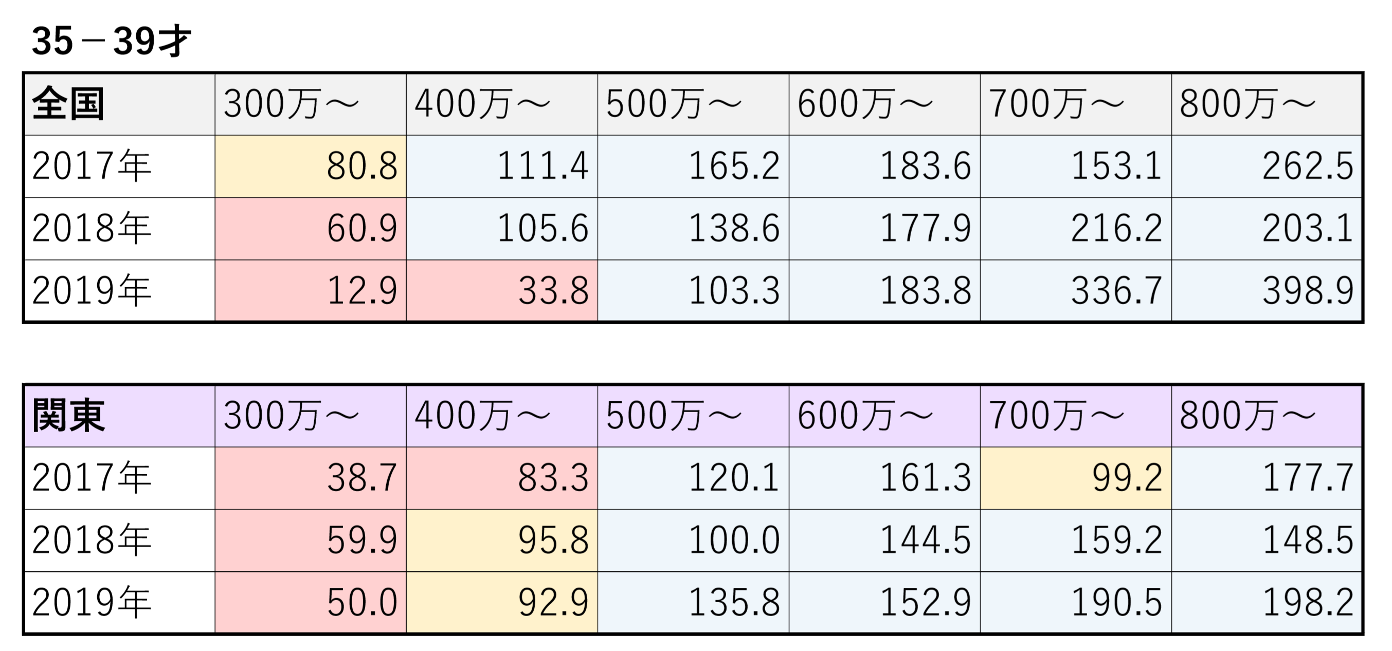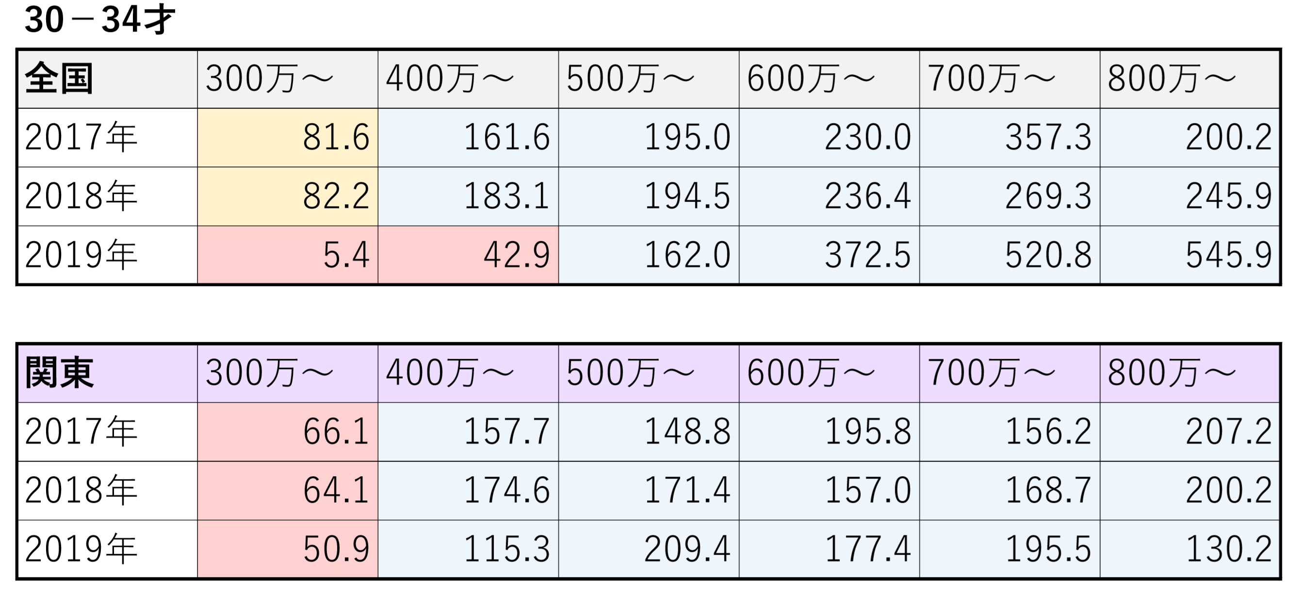 30代前半も全国・関東は「年収400万~」が成婚しやすい。