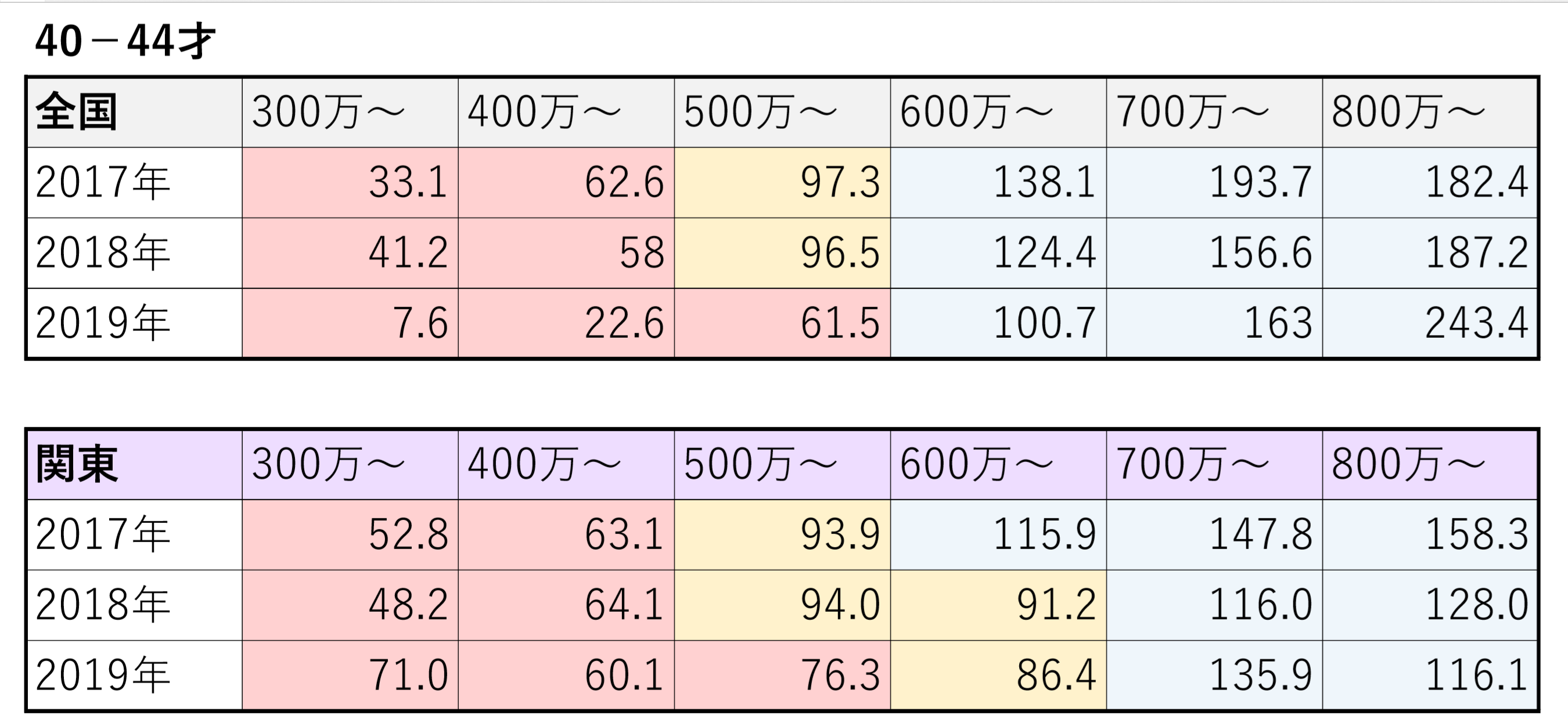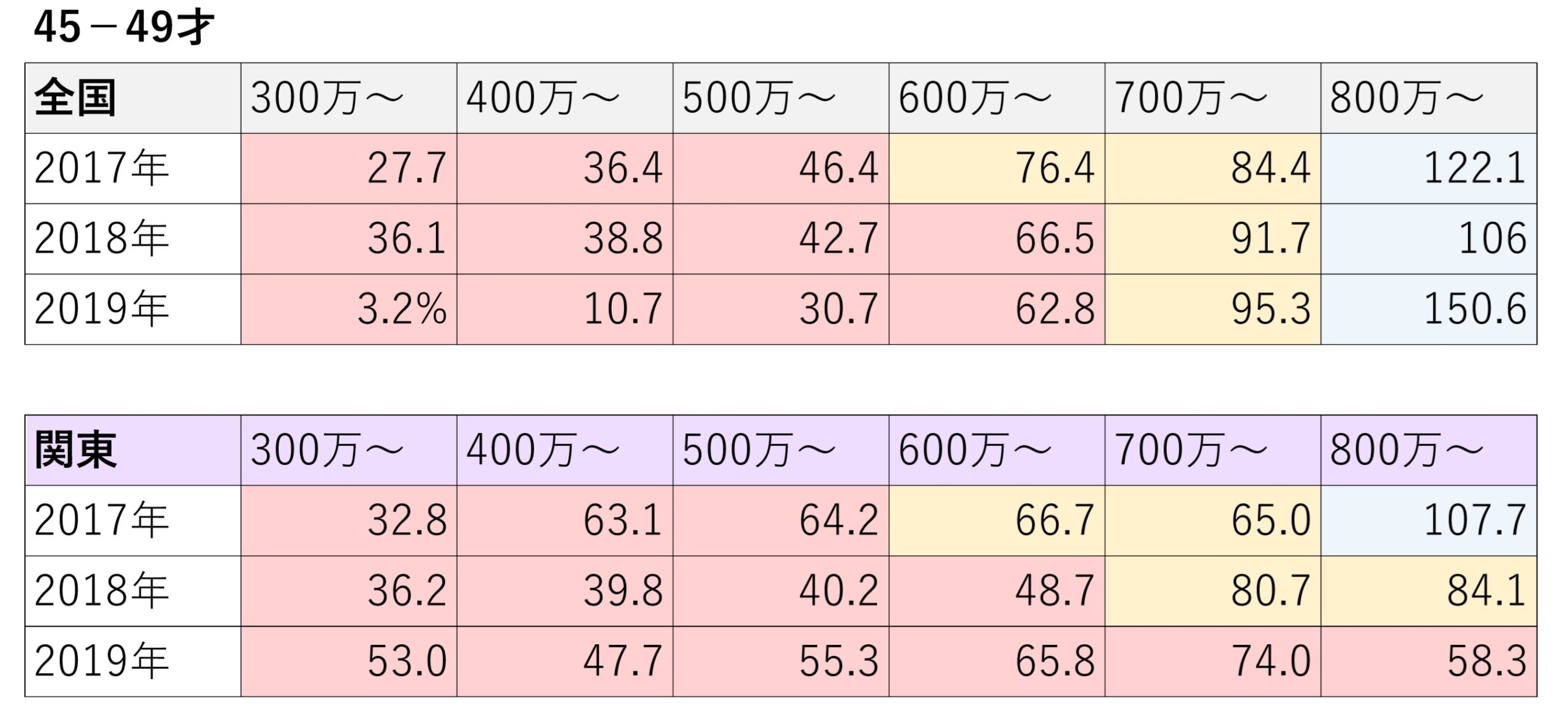 全国、関東ともに「年収500万~」が成婚しやすい。