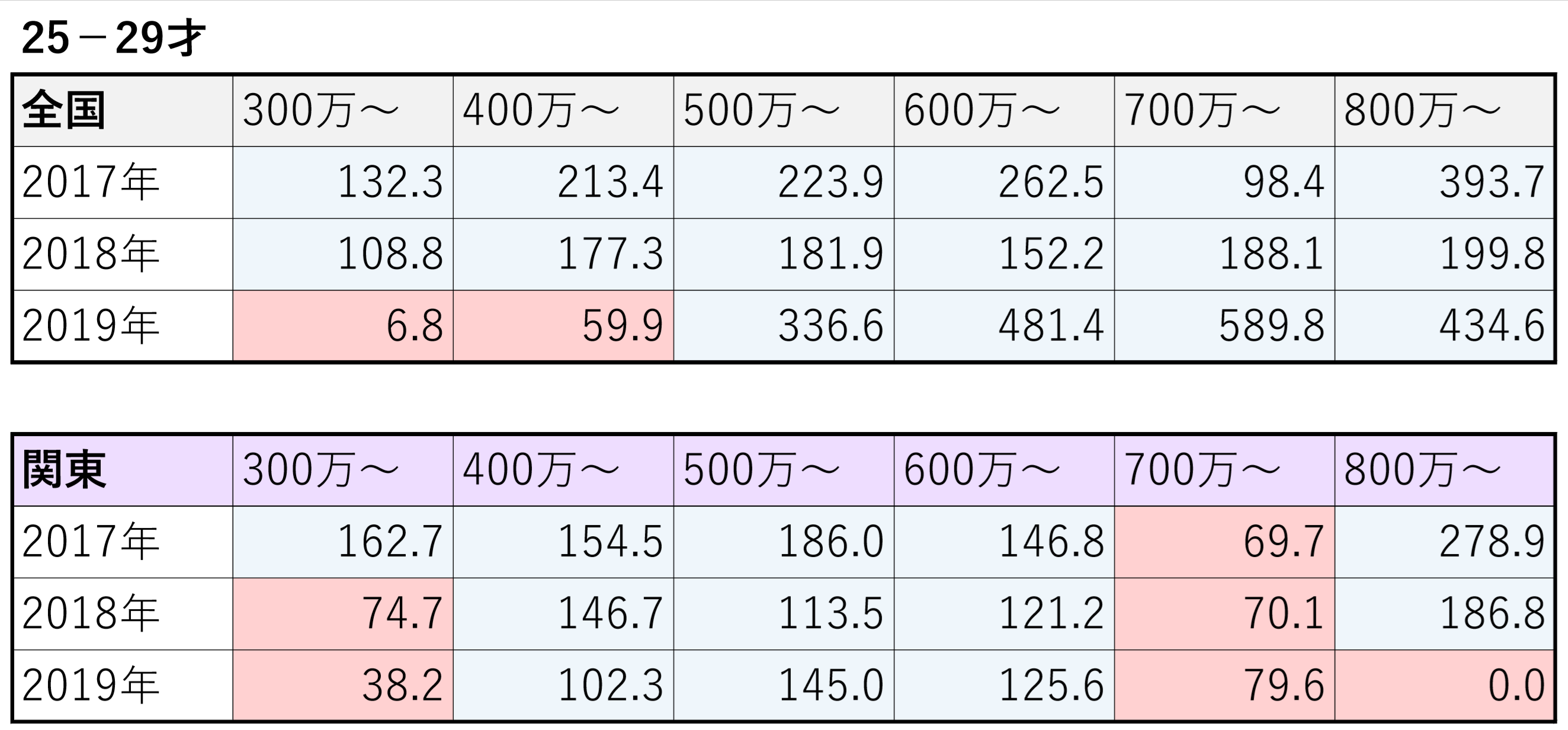 20代後半は全国・関東共に「年収400万~」が成婚しやすい。