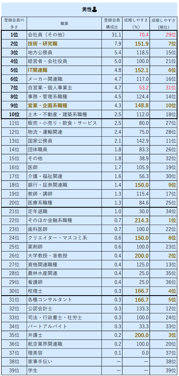 ただ、ベスト10に入っていた「成婚しやすい職種」は会員数の多さからみると、10位までは3職種しかランクインしていません。