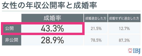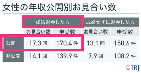IBJ成婚白書によると年収を公開している女性のほうが男性からのお申し込みも多く、結果的にお見合いも多い傾向です。